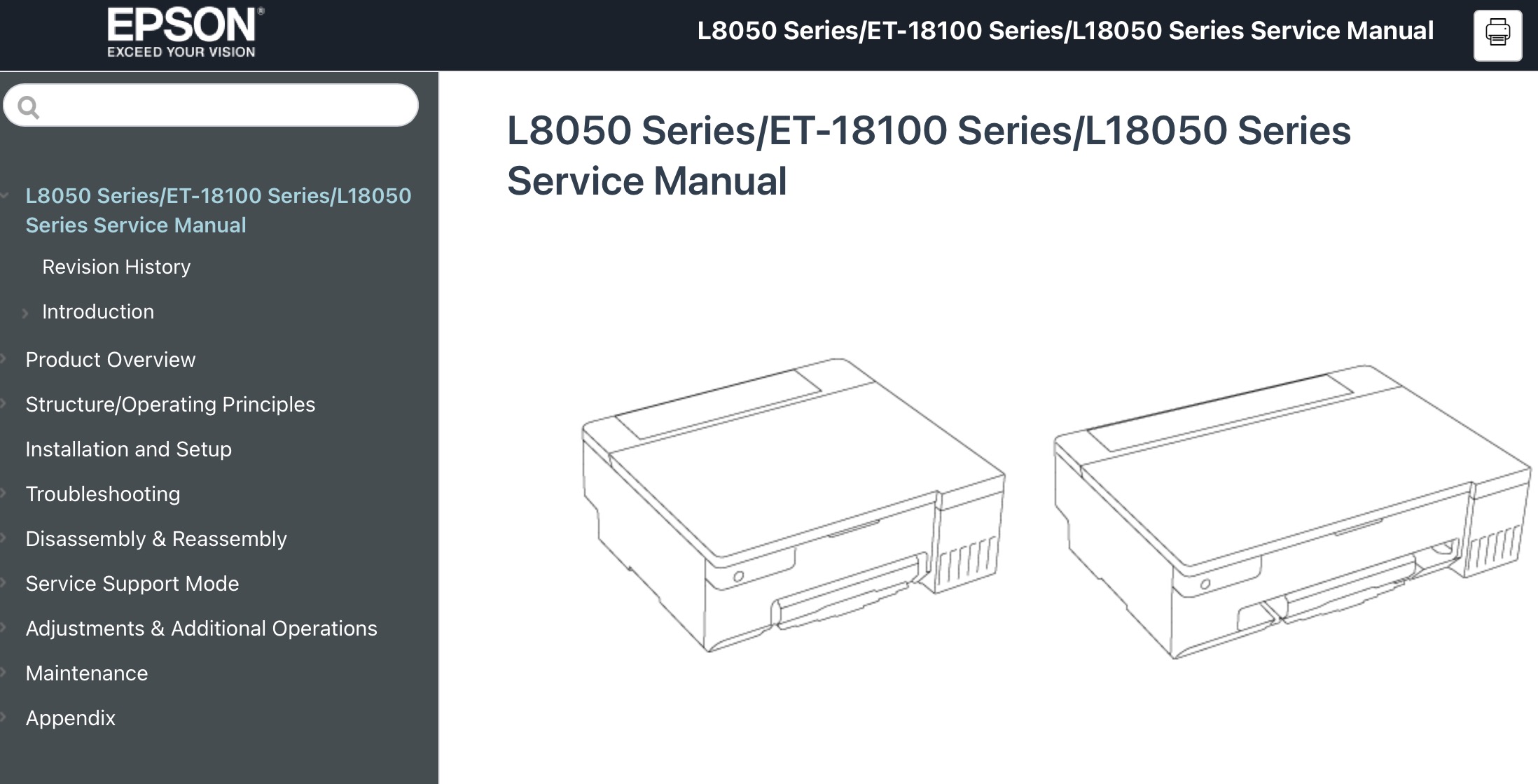 Este manual de servicio Epson L8050 Series, L18050, ET-18100 Series describe las funciones básicas, la teoría de las operaciones eléctricas y mecánicas, los procedimientos de mantenimiento y reparación de la impresora.