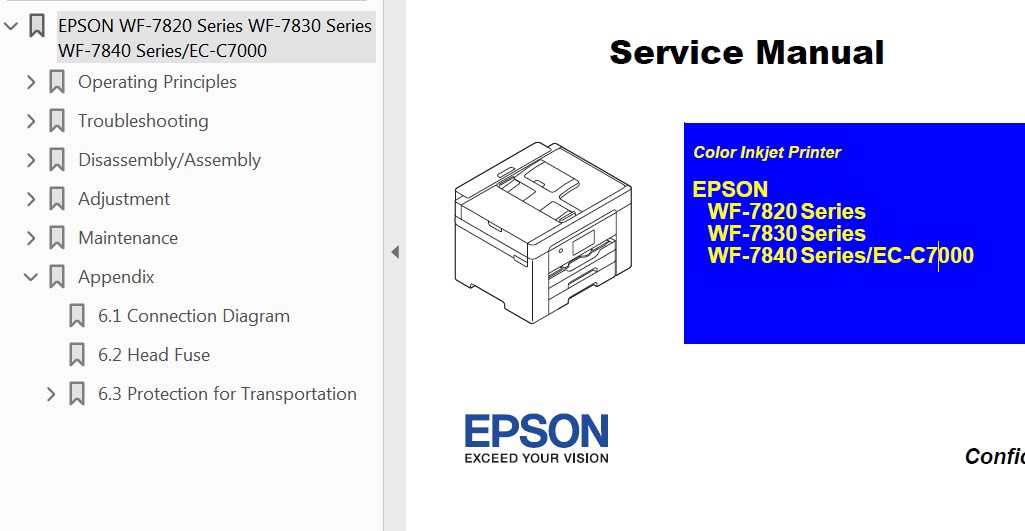 Este manual de servicio Epson WF-7820 Series, WF-7830 Series, WF-7840 Series, EC-C7000 Series describe las funciones básicas, la teoría de las operaciones eléctricas y mecánicas, los procedimientos de mantenimiento y reparación de la impresora.