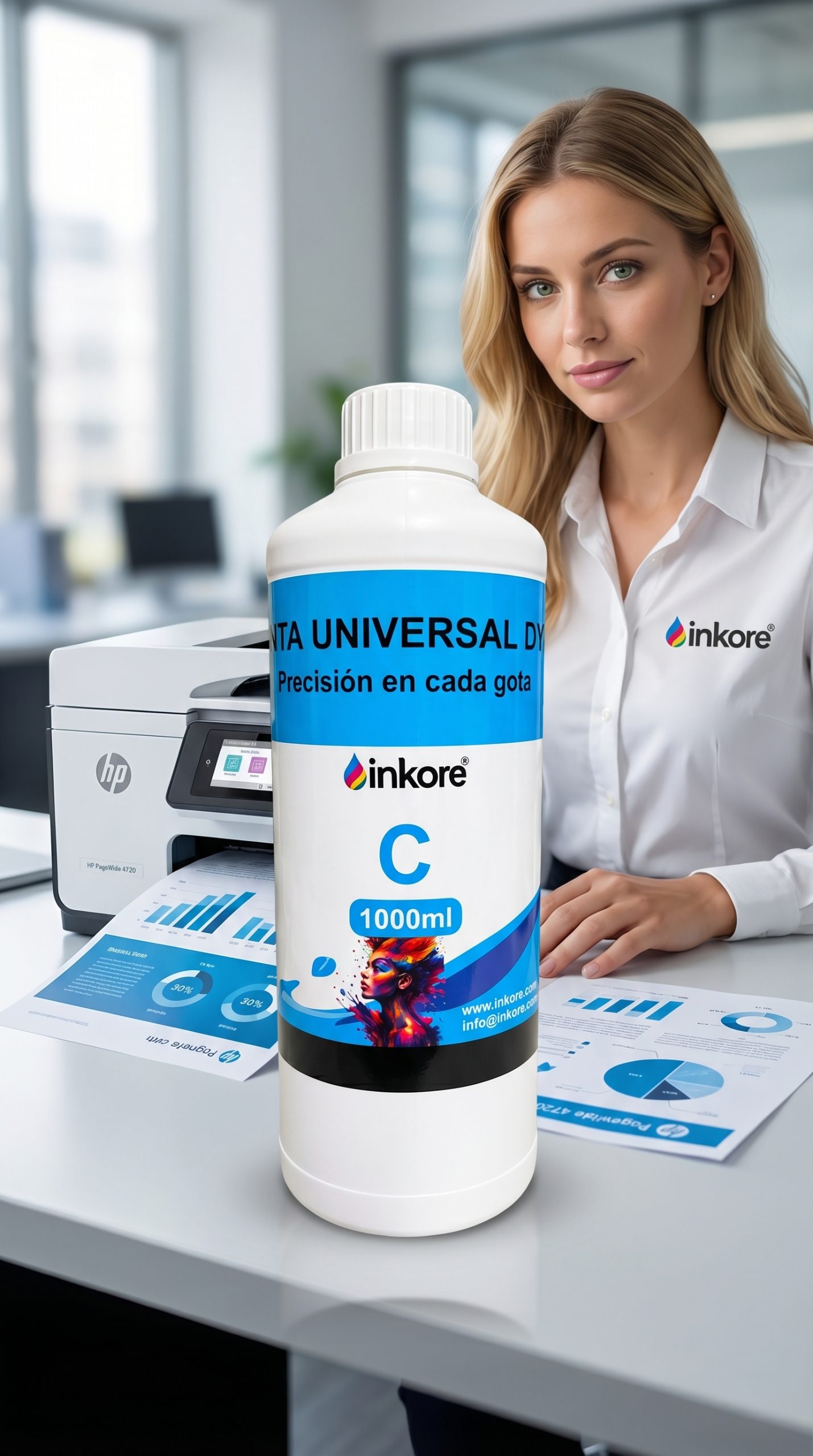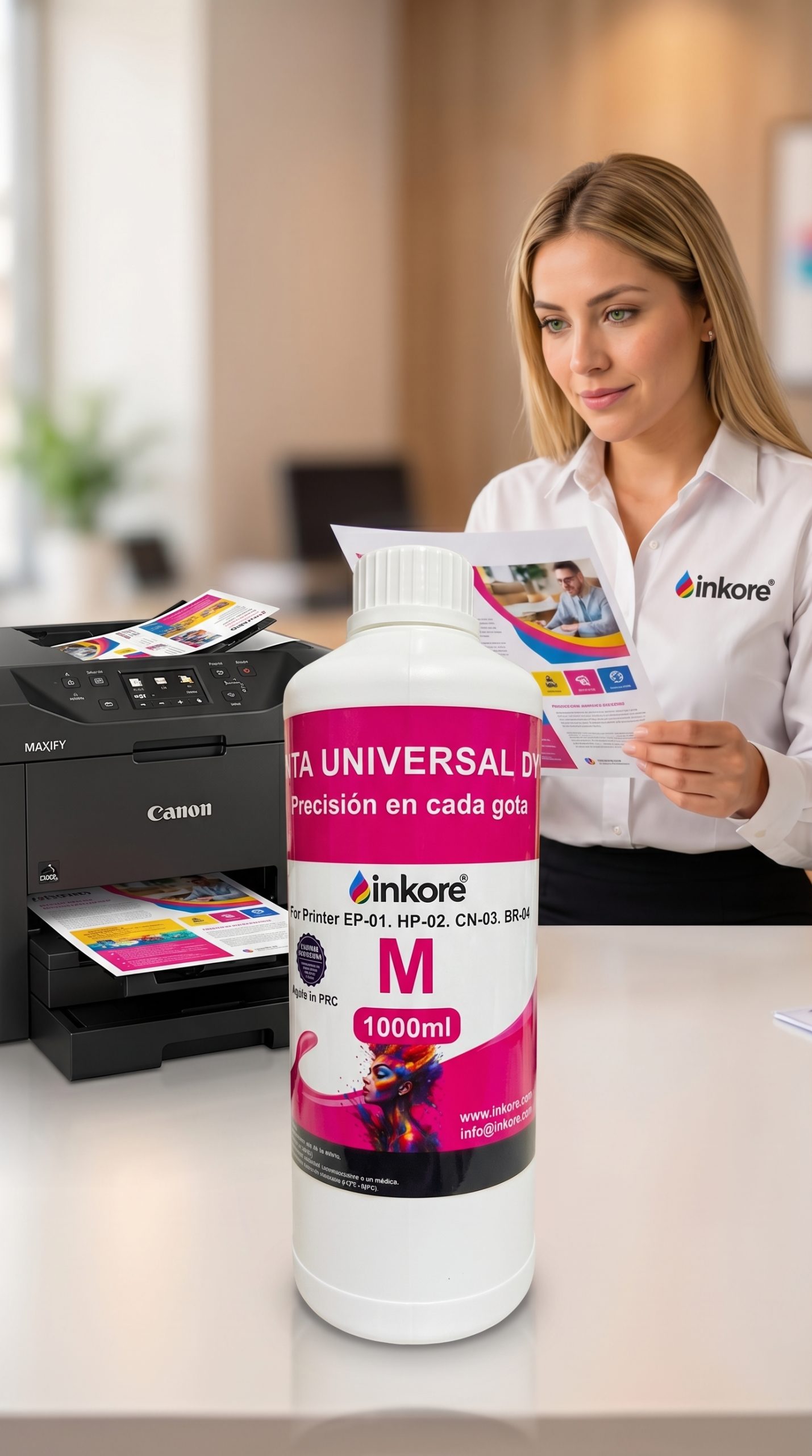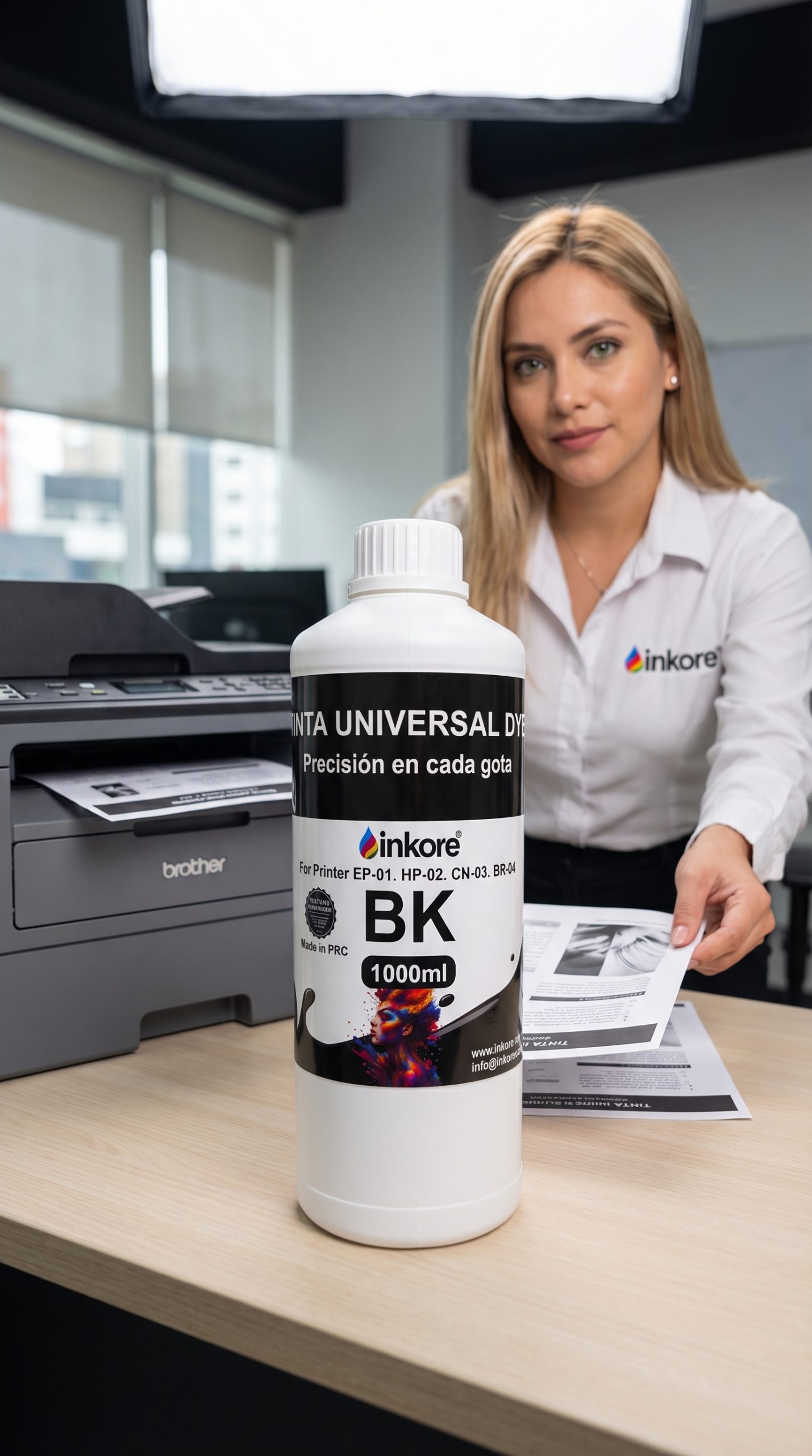 La tinta Inkore® Premium Universal DYE de 1000 ml es una formulación avanzada de alto rendimiento, desarrollada para ofrecer colores intensos, negros profundos y un flujo de tinta estable, garantizando impresiones limpias, uniformes y consistentes tanto en uso doméstico como profesional.